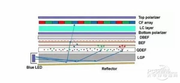 通俗點(diǎn)說(shuō),目前的量子點(diǎn)顯示器就是在VA面板中加了一張膜,也就是上圖中的那張QDEF膜。
